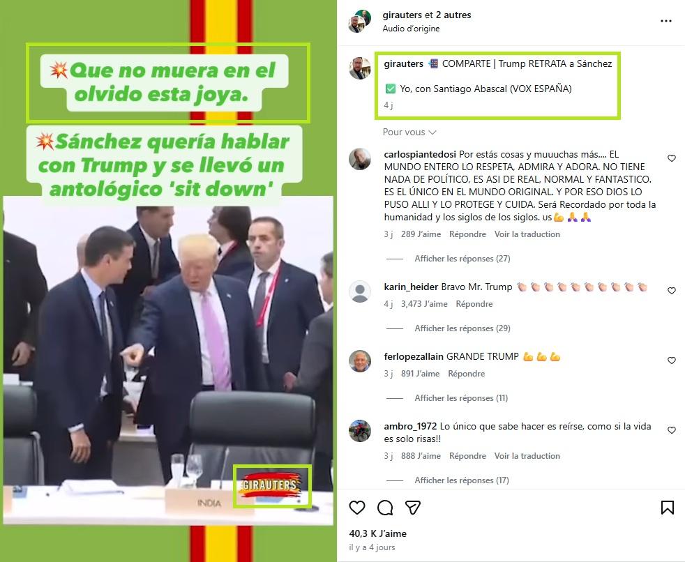 "Que ce bijou ne tombe pas dans l'oubli. Sánchez voulait parler avec Trump et il s'est pris un anthologique 'assieds-toi'", peut-on lire en espagnol dans le texte incrusté dans la vidéo.