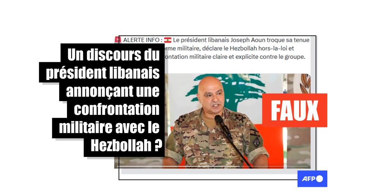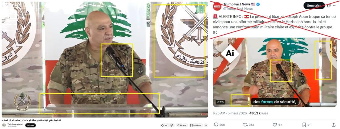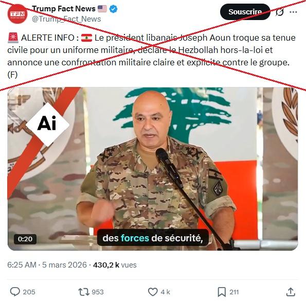 Il a "troqué sa tenue civile pour un uniforme militaire", affirme ainsi un post X aimé plus de 4.000 fois depuis sa publication le 5 mars 2026. "Le président libanais s'est déguisé et a déclaré la guerre au Hezbollah", renchérit un compte Facebook administré depuis le Sénégal.