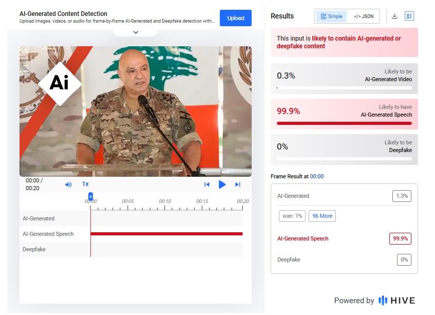Une voix tout à fait similaire à la sienne scande, notamment, en arabe : "J’ai donné l’ordre à l’armée et aux forces de sécurité (...) d’appliquer immédiatement le plan de l’armée visant au désarmement du Hezbollah au nord du fleuve Litani, y compris par la force, même si cela devait mener à une confrontation entre l’armée et le Hezbollah".