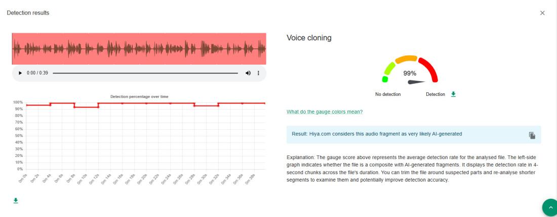 Même conclusion du logiciel de détection Hive Moderation, qui estime là encore à 99% la probabilité que la bande son ait été générée par IA.