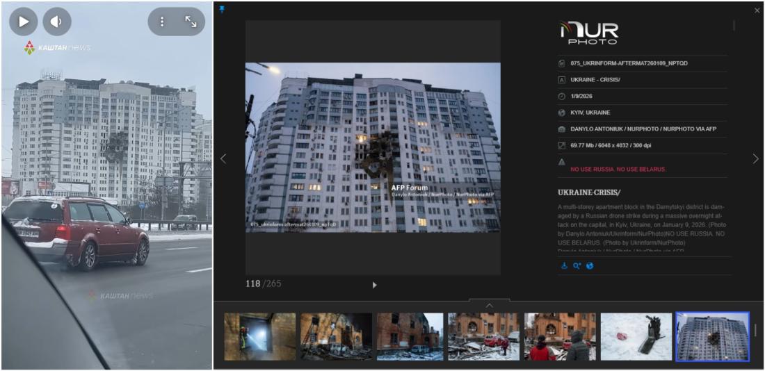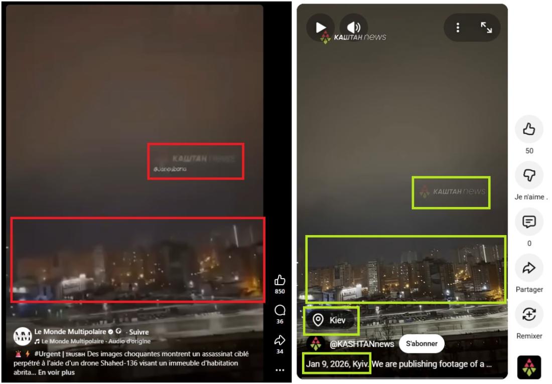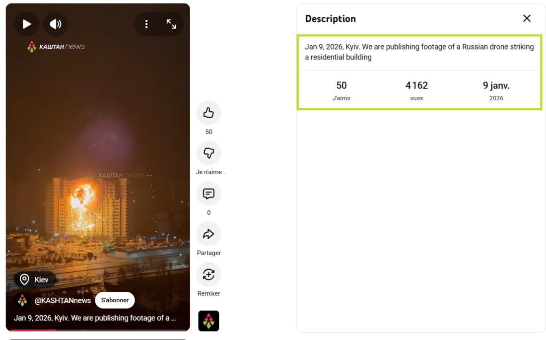 Une recherche d'image inversée sur Google a permis à l'AFP de retrouver la même séquence, publiée dès le 9 janvier 2026 sur la chaîne YouTube du site d'information ukrainien КАШТАН News (KASHTAN News) : "9 janvier 2026, Kiev. Nous publions des images montrant un drone russe frappant un immeuble résidentiel", peut-on lire dans la description de la vidéo en anglais (lien archivé ici).