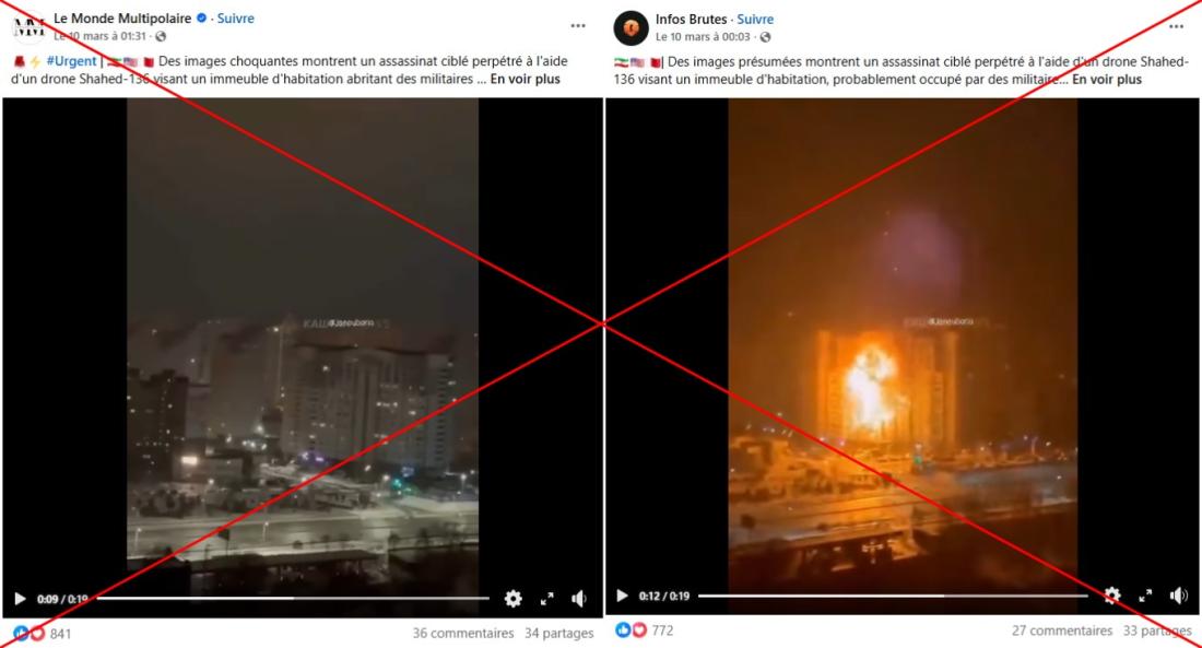 Dans ce contexte, plusieurs publications sur les réseaux sociaux ont diffusé une séquence de 19 secondes, prétendument tournée la nuit et montrant l'impact d'un drone sur un bâtiment qui prend instantanément feu.