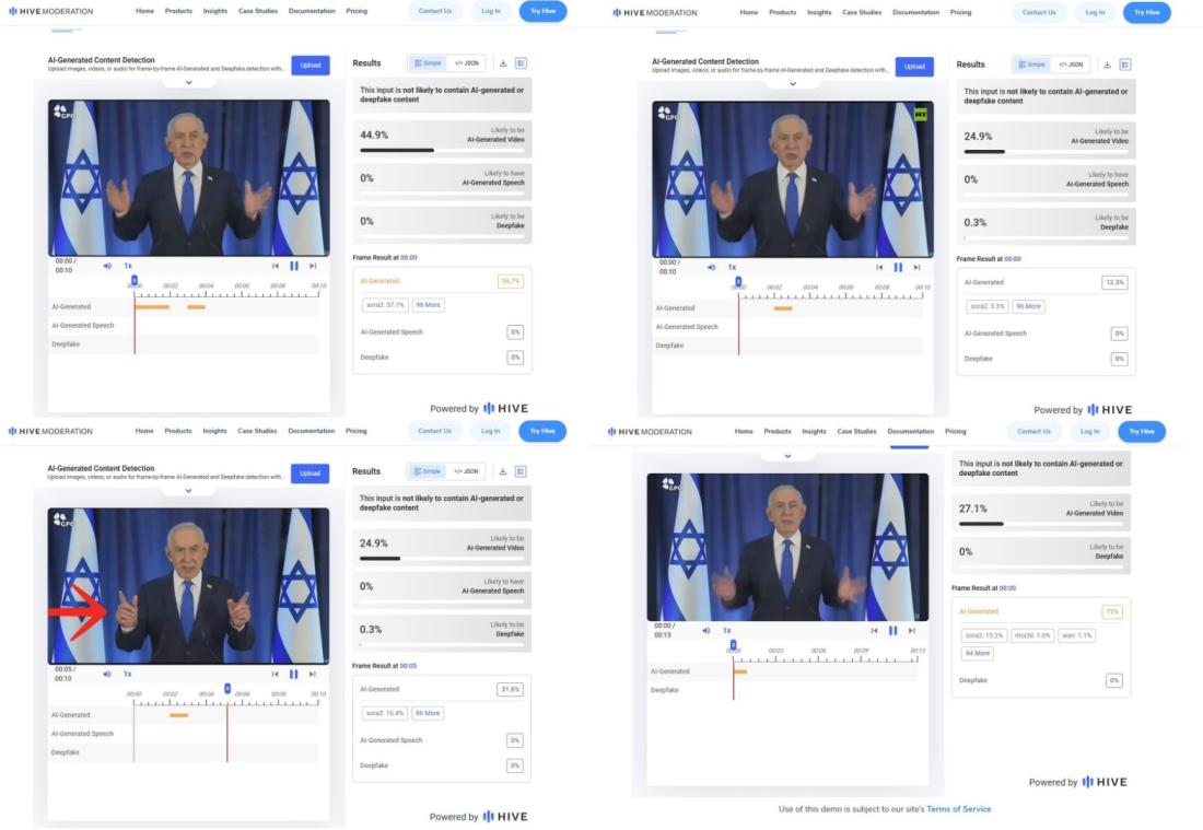 Mais en ligne, des internautes ont mis en doute l'authenticité des images relayées par la chaîne : d'après eux, l'extrait serait une vidéo générée par IA car le dirigeant israélien aurait "six doigts" visibles sur certains plans (lien archivé ici).