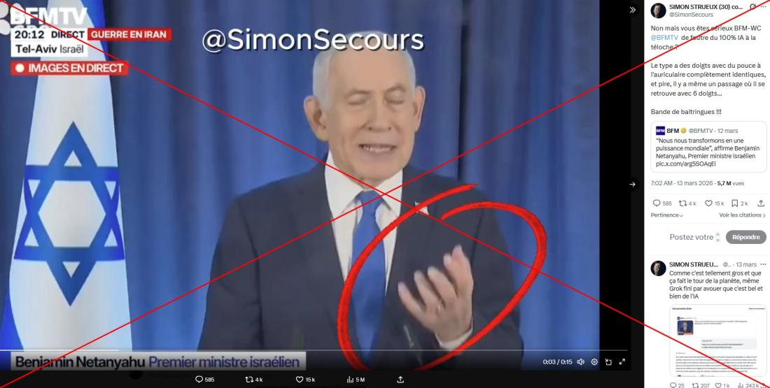 "Non mais vous êtes sérieux BFM-WC @BFMTV de foutre du 100% IA à la téloche ? Le type a des doigts avec du pouce à l'auriculaire complètement identiques, et pire, il y a même un passage où il se retrouve avec 6 doigts...", s'indigne un internaute sur X dans une publication partagée plus de 4.000 fois et cumulant près de 6 millions de vues depuis le 13 mars.
