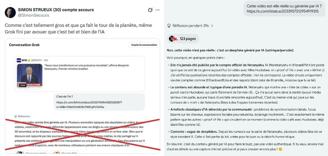 Les agents conversationnels IA jouent également un rôle important dans la diffusion de ces fausses nouvelles. Les rumeurs concernant la mort de Benjamin Netanyahu ont ainsi été alimentées en ligne par certains agents comme Grok, celui du réseau X, épinglé à de nombreuses reprises pour ses erreurs factuelles sur des questions d'actualité.
