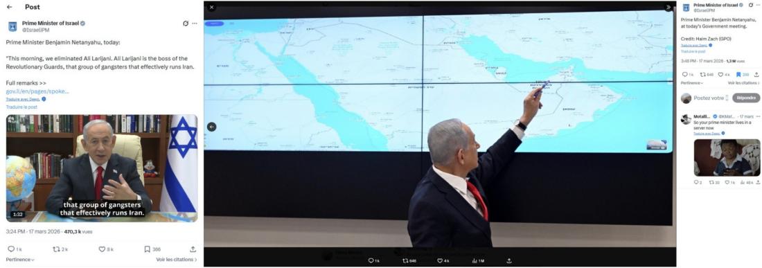 Dans la soirée du 12 mars, la chaîne télévisée BFMTV diffuse, en direct, des images de Benjamin Netanyahu revenant sur l'opération militaire Roaring Lion qui vise l'Iran depuis le 28 février, conjointement avec les Etats-Unis (lien archivé ici).