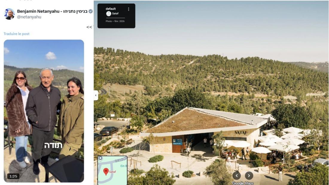 Une vidéo publiée le lendemain sur le compte X de Benjamin Netanyahu le montre à l'extérieur de l'établissement, discutant avec des clients attablés (lien archivé ici). On distingue en arrière-plan la même colline visible sur des photos disponibles sur la page Google Maps de la pâtisserie (lien archivé ici).