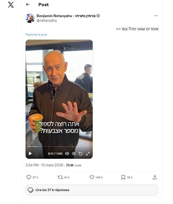 Trois jours après la diffusion de l'allocution, une vidéo a été mise en ligne sur le compte X de Benjamin Netanyahu. On y voit le Premier ministre dans un café des environs de Jérusalem, parlant avec des membres de son équipe et plaisantant sur les rumeurs concernant sa mort.