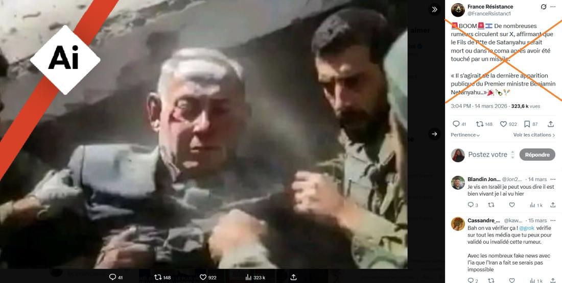 D'autres publications ont partagé des images censées montrer le corps de Benjamin Netanyahu, curieusement intact, être extrait de décombres après un bombardement présumé - des images vraisemblablement générées par IA, dont on ne retrouve aucune trace en dehors de comptes habitués à propager de la désinformation.