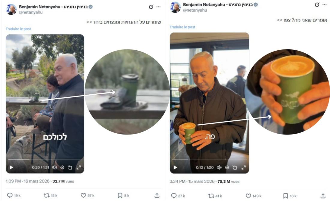 "De plus, il y a plusieurs angles de prise de vue à la vidéo, et le café a lui-même a mis en ligne une photo de lui [Netanyahu, NDLR]", pointe Henry Ajder, en référence à une photo publiée par le café dans lequel a été tournée la vidéo (lien archivé ici).