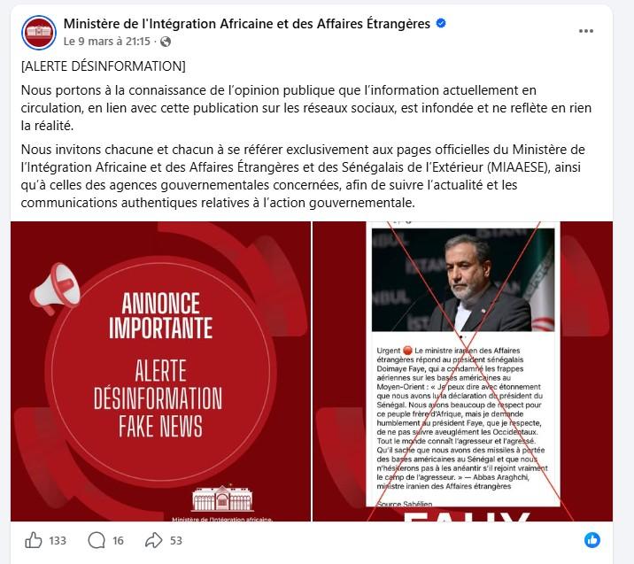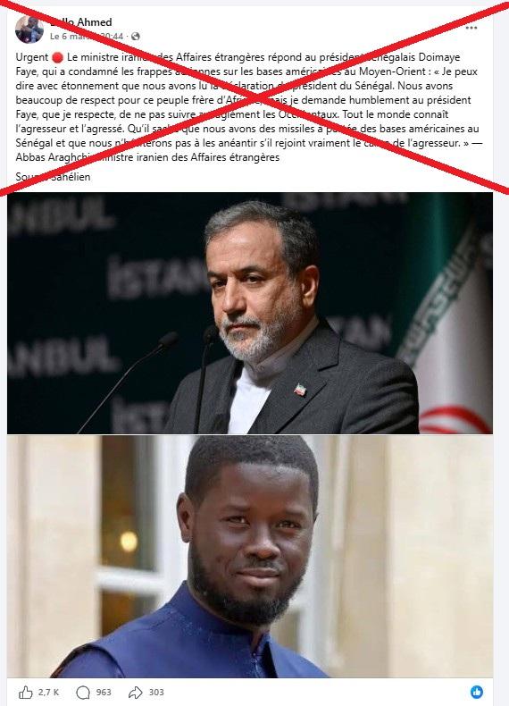"Je peux dire avec étonnement que nous avons lu la déclaration du président du Sénégal. (...) Je demande humblement au président Faye, que je respecte, de ne pas suivre aveuglément les Occidentaux", aurait déclaré Abbas Araghtchi, selon cette publication qui cumule 4.200 mentions "j’aime".