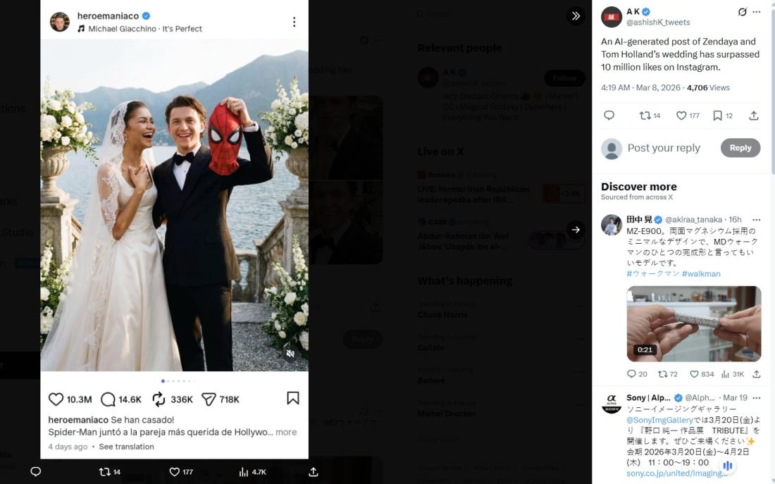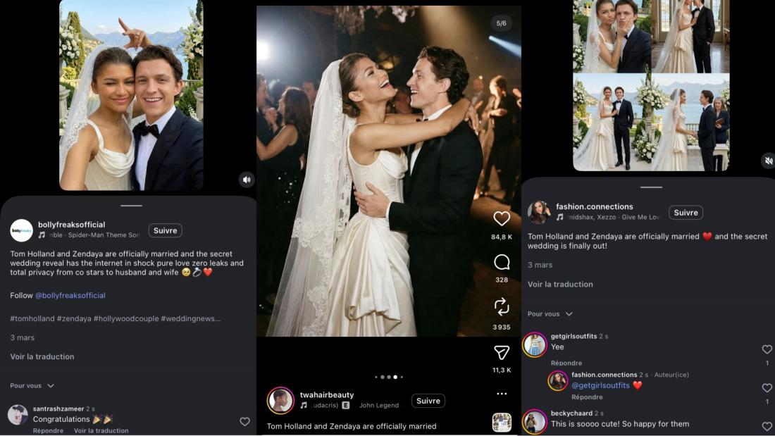 Une recherche d'images inversée, a permis à l'AFP de retrouver ces photos partagées par le compte X "AK" qui partage du contenu cinéma lié à l'univers Marvel. Le 8 mars, il publie une capture d'écran d'une publication du compte "heroemaniaco" partageant les photos du prétendu mariage du couple d'acteurs et précise en légende "Une publication générée par une IA montrant le mariage de Zendaya et Tom Holland a dépassé les 10 millions de mentions 'j’aime' sur Instagram." (lien archivé ici)