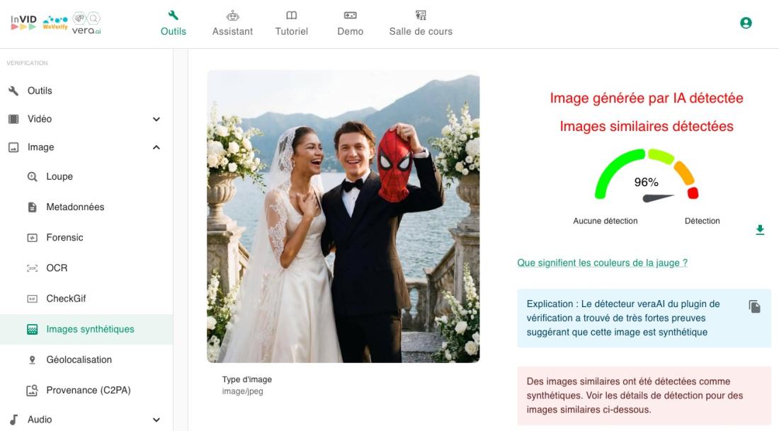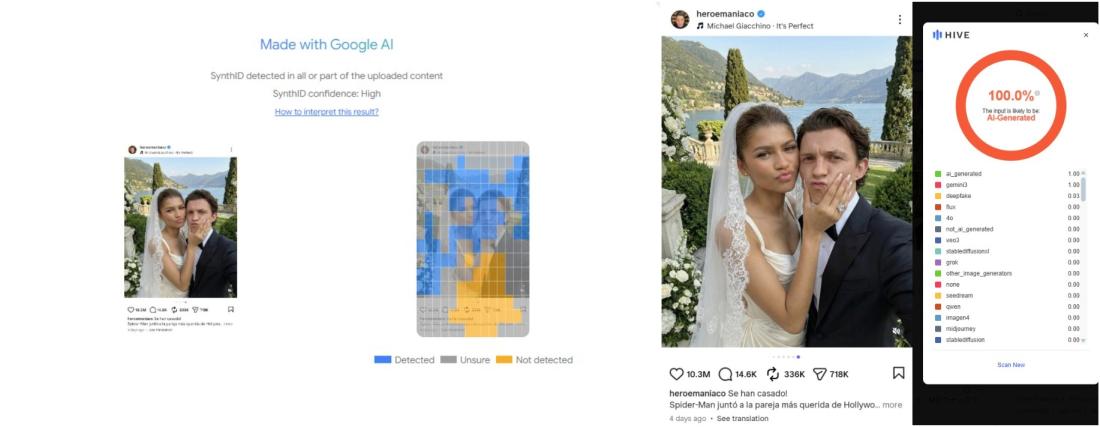 Enfin, il existe plusieurs outils de détection d'IA, comme Hive Moderation, et SynthID, qui concluent en l'occurrence qu'il s'agit d'images générées par IA. Le second, développé par Google, précise même que ces images du couple d'acteurs ont été générées par l'IA de Google.