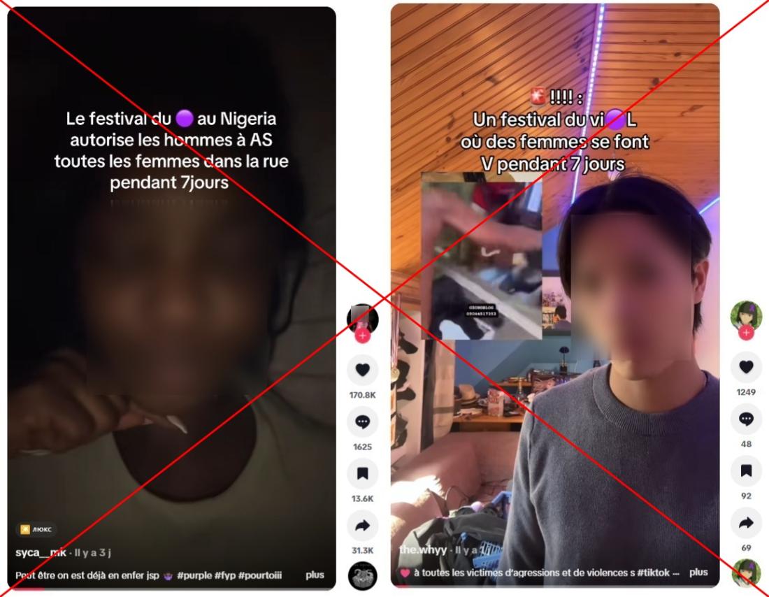 Des femmes poursuivies, isolées, déshabillées : ces scènes d'agression très violentes sont devenues virales depuis le 19 mars 2026 sur les réseaux sociaux. Elles ont été filmées dans le sud du Nigeria, alors que la communauté Oramudu se préparait à célébrer un festival de la fertilité au cours duquel des prêtres "bénissent" les femmes mariées. Des internautes qualifient l'événement de "festival du viol", affirmant qu'il autoriserait des violences sexuelles contre les femmes seules. Mais si des agressions graves ont bel et bien eu lieu à la même date que le festival, celui-ci n'autorise ni n'encourage aucune agression contre les femmes, selon le président de la région à l'AFP. Au Nigeria, en 2024, 21% des femmes de 15 à 49 ans ont subi des violences physiques ou sexuelles.