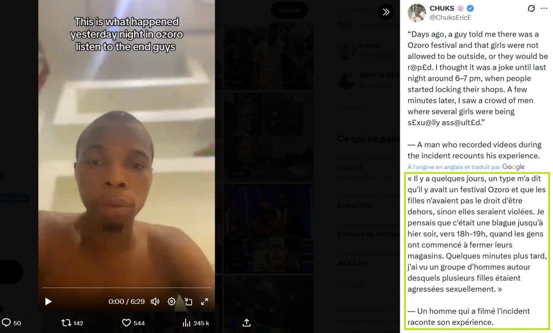 "Un festival qui autorise les hommes à violer toutes les femmes qui sont présentes dans la rue pendant 7 jours. Ça se passe au Nigeria, dans le village d'Ozoko ou Ozoro", affirme une internaute dans une vidéo TikTok, partagée 33.200 fois et cumulant 2 millions de vues depuis le 20 mars 2026. "Dans quel monde on vit en fait ? Parce qu'en plus c'est sous couvert de 'tradition' : 'C'est la tradition, on ne touche pas'", s'indigne-t-elle.