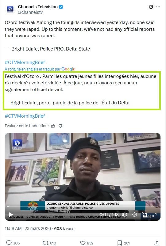Dans un entretien accordé le 23 mars au média nigérian Channels Television, le porte-parole de la police de l'État du Delta, Bright Edafe, a également déclaré qu'"aucun rapport de viol n'a été déposé en lien avec le festival" (liens archivés ici, ici et ici).