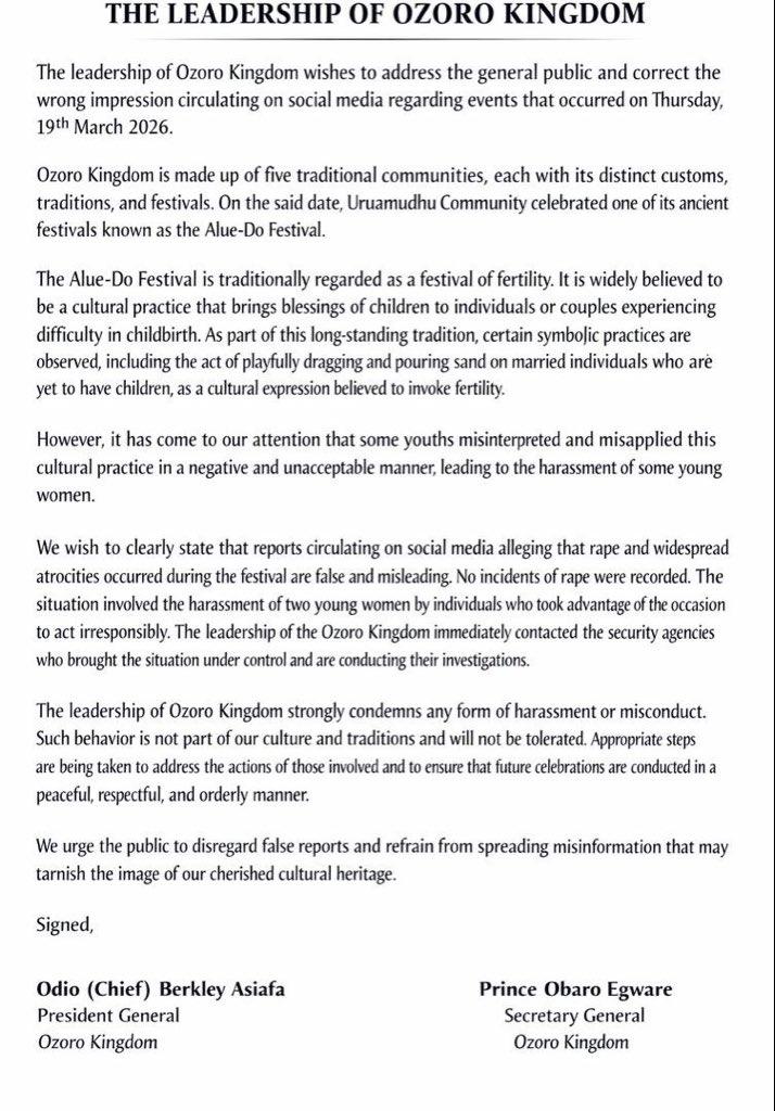 Mais d'après Asiafa Berkley, "certains jeunes ont mal interprété et détourné cette pratique culturelle de manière inacceptable, ce qui a conduit au harcèlement de jeunes femmes", a-t-il expliqué dans un communiqué de presse signé conjointement avec le secrétaire du royaume d'Ozoro, Obaro Egware, dans lequel ils "condamnent fermement" ces comportements "qui ne font pas partie de la culture locale et ne seront pas tolérés" (lien archivé ici).