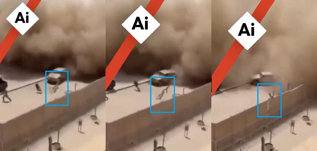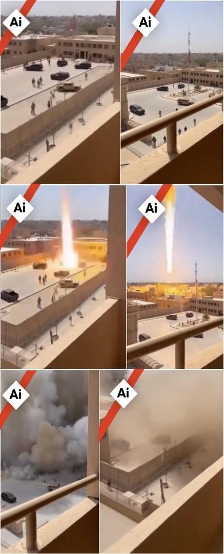 On y retrouve les mêmes éléments d'une vidéo à l'autre : le balcon, l'angle de vue, les personnages et véhicules, le drapeau au centre de la cour, le nombre de frappes et les nuages de fumée, laissant penser qu'il s'agit de deux vidéos générées avec les mêmes instructions sur un modèle de création IA.