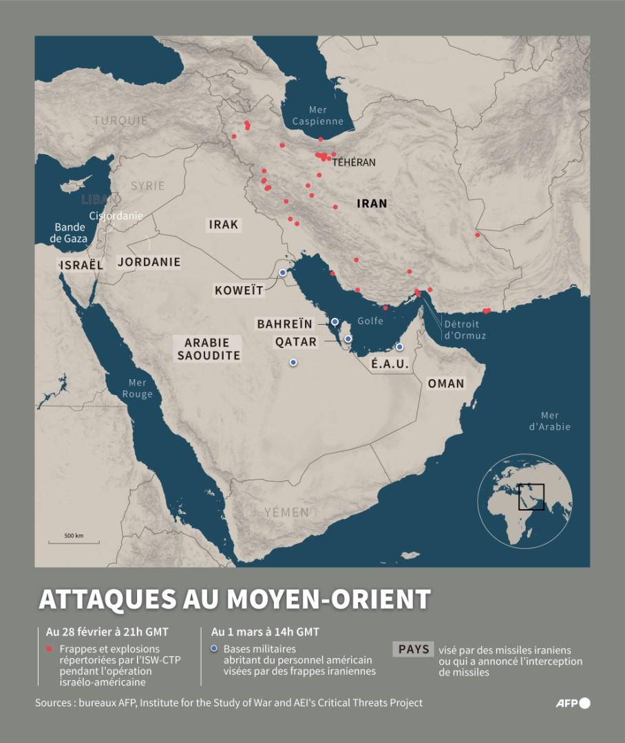 L'Iran subit des frappes sur ses installations militaires et énergétiques, tandis que la capitale Téhéran est régulièrement la cible de tirs. En réaction, le pays multiplie les attaques de missiles à moyenne portée et de drones visant les pays du Golfe afin de faire pression sur les Etats-Unis, dont il cible également les bases militaires dans la région.