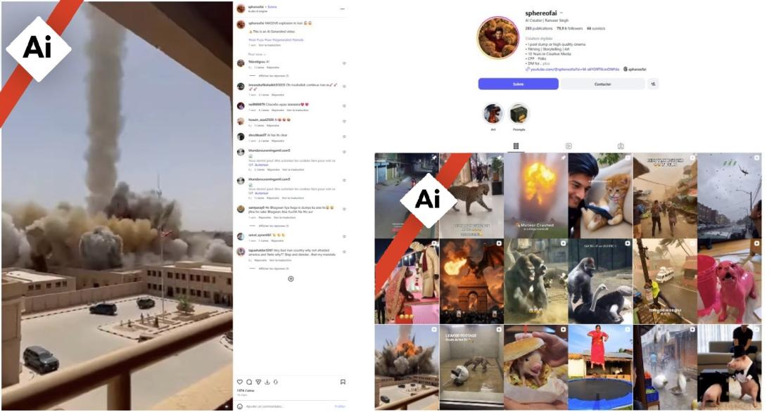 La vidéo dont elles sont issues a été mise en ligne le 16 mars par le compte "sphereofai", dédié à la diffusion de vidéos créées par IA, et inclut une mention "Cette vidéo a été générée par IA" (lien archivé ici).