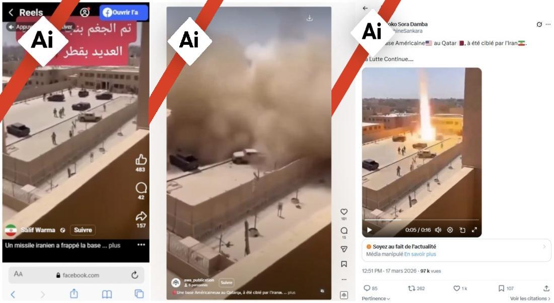 "LA BASE AMÉRICAINE AU QATAR est frappé par’l’IRAN [sic]", s'exclame un internaute en légende d'une vidéo publiée sur Facebook, le 17 mars 2026, comptant plus de 2.600 likes et des centaines de milliers de vues. "Ce n'est pas de l'IA", précise une mention placée sur la vidéo, sur laquelle on peut voir deux missiles s'abattre au milieu d'une cour entourée de clôtures barbelées. La présence de silhouettes à l'endroit de l'impact juste avant la frappe laisse supposer que ce bombardement aurait fait des blessés ou des morts.