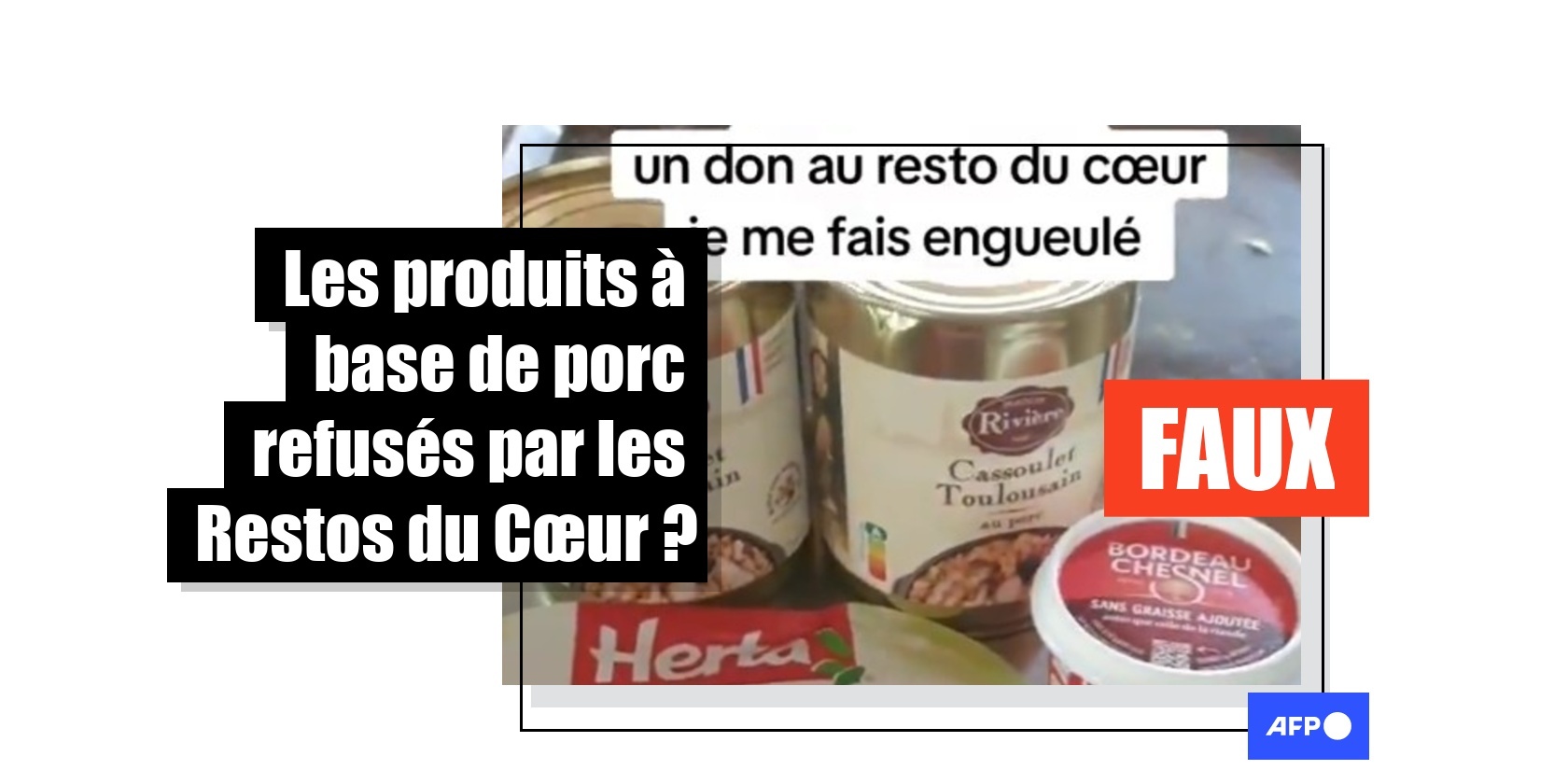 Début mars 2026, les Restos du Cœur étaient présents dans des milliers de supermarchés en France, pour leur collecte annuelle de dons alimentaires. Comme chaque année à cette occasion, l'affirmation selon laquelle l'association refuserait les produits à base de porc se répand sur les réseaux sociaux dans des posts cumulant des millions de vues et des milliers de partages. Elle n'a pourtant aucun fondement: l'association fondée par Coluche en 1985 l'a plusieurs fois démentie, et l'AFP a pu constater la présence de produits à base de porc lors d'une distribution.