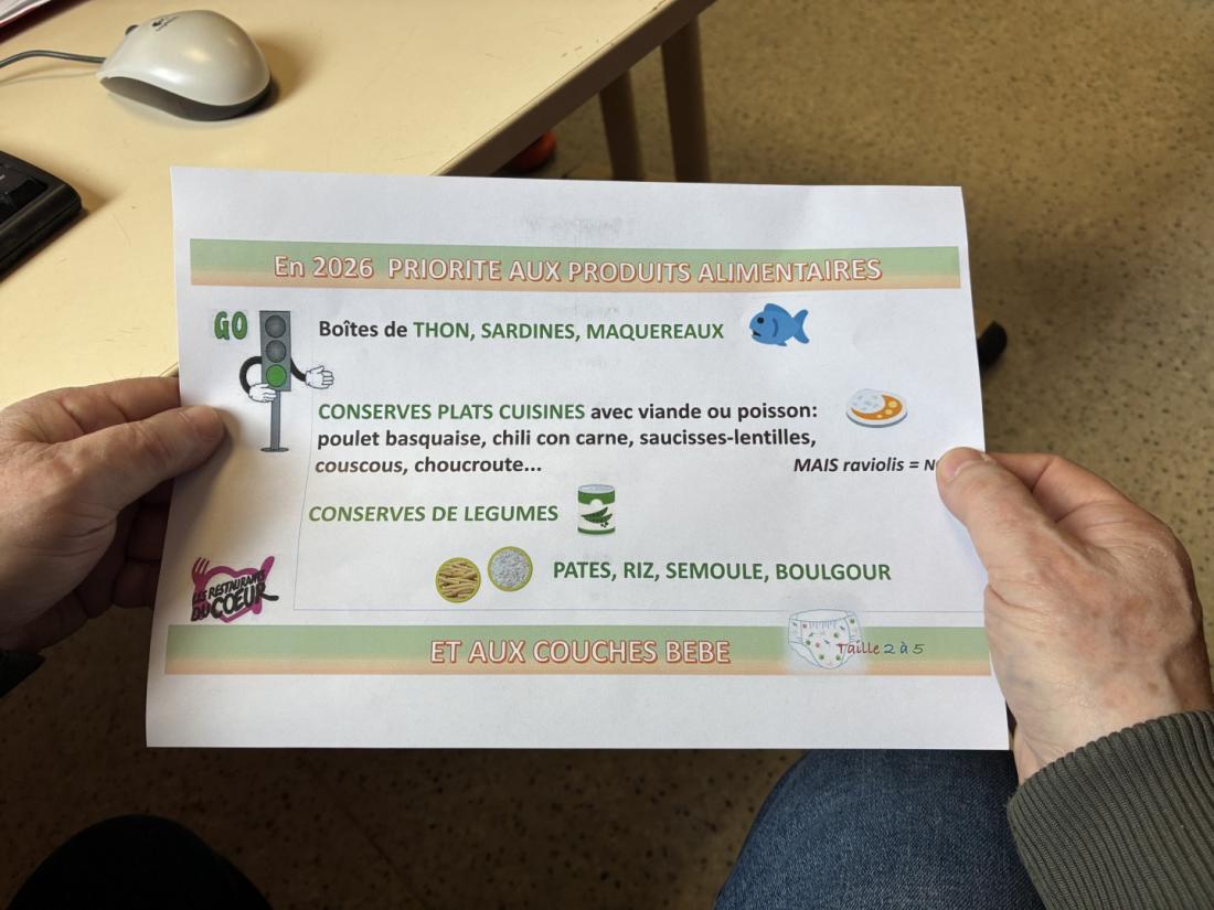 Dans un bureau du centre, Jean-Luc Moine tend un papier intitulé "En 2026 priorité aux produits alimentaires et aux couches bébé". "C'est ce que nous distribuons à nos bénévoles", indique-t-il. Une sorte de pense-bête énumérant des exemples de denrées à demander en priorité aux donateurs lors des collectes. Il y est écrit : "conserves plats cuisinés avec viande ou poisson : [...] saucisses-lentilles". Un plat à base de porc fait donc même partie des exemples de denrées à privilégier.