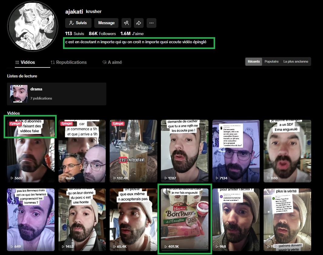 En tapant "Restos du Cœur porc" dans la barre de recherche de TikTok, on retrouve ainsi la vidéo dans une publication du compte "krusher", publiée, elle aussi, le 22 mars. Avec 400.000 vues en trois jours, il s'agit d'une des vidéos les plus vues du compte.