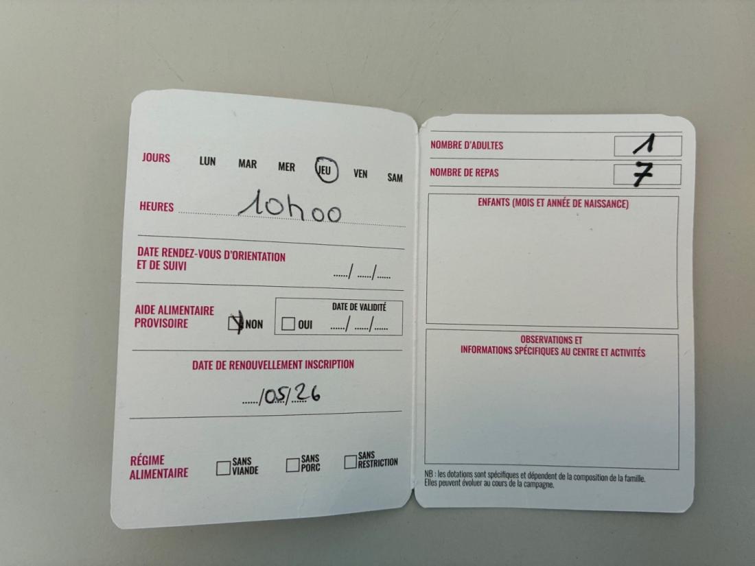 Ici, chaque bénéficiaire des distributions alimentaire a sa "carte", un petit dépliant regroupant les informations nécessaires pour les dons : la date et l'heure de rendez-vous, le nombre d'adultes bénéficiaires, le nombre de repas à prendre en compte. Ainsi que le régime alimentaire, avec trois possibilités: "sans viande", "sans porc", ou "sans restriction".