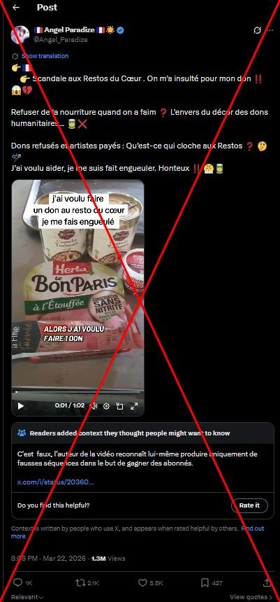 "Scandale aux Restos du Cœur. On m'a insulté pour mon don !!", affirme une publication X datant du 22 mars 2026, cumulant plus de 2.000 partages et presque 6.000 likes. Dans la vidéo associée, on observe deux boîtes de cassoulet, un pot de rillettes, un saucisson et du jambon. Un homme, dont le visage n'apparaît pas, affirme avoir été qualifié de "honteux" par une bénévole des Restos du Cœur, à cause du contenu de son supposé don de nourriture.