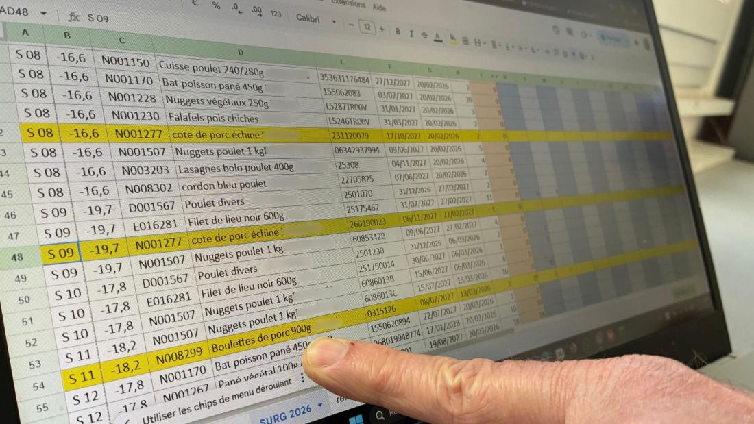 Devant son ordinateur, Jean-Luc Moine présente sur un tableur de suivi des produits surgelés réceptionnés par le centre : "Regardez : côte de porc échine et boulettes de porc". "On distribue ce qu'on nous livre, et nous passons aussi des commandes par nous-mêmes", fait-il savoir.