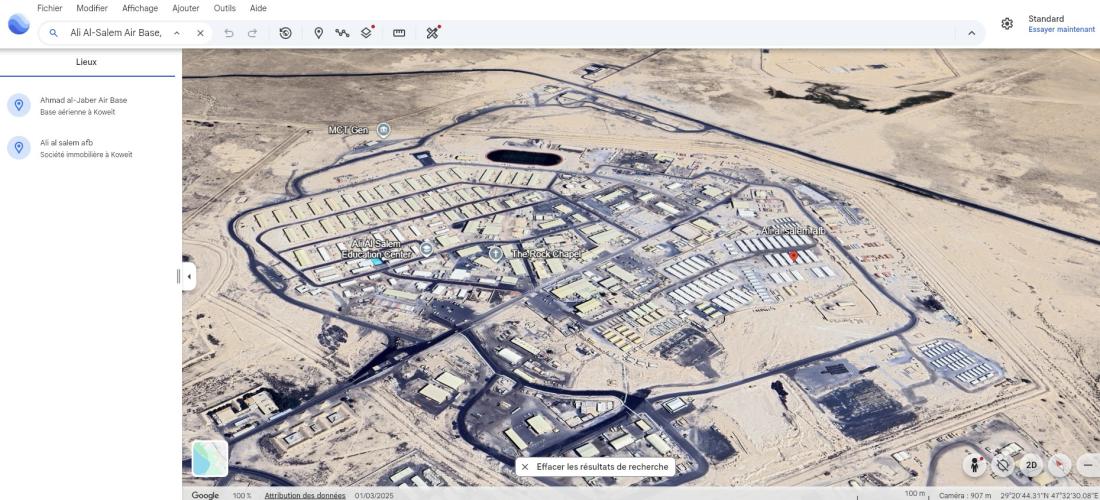 Par ailleurs, l'agencement des bâtiments visibles en arrière-plan de la vidéo ne correspond pas à celui des structures visibles sur des images satellites de la base Ali Al Salem, visibles sur le site Google Earth.