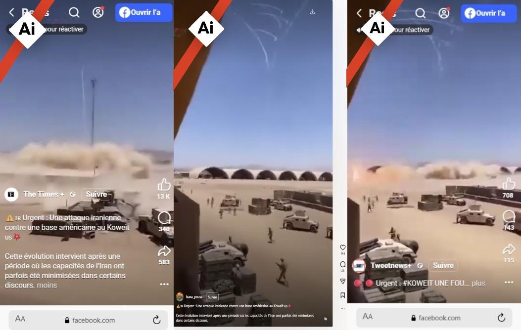 "Urgent : Une attaque iranienne contre une base américaine au Koweït", écrit un internaute en légende d'une vidéo publiée sur Facebook à la mi-mars, vue près d'un million de fois et cumulant 12.000 "J'aime". "Cette évolution intervient après une période où les capacités de l'Iran ont parfois été minimisées dans certains discours", ajoute le compte qui a partagé la vidéo : on y voit des hommes courir près de ce qui semble être un aérodrome dans le désert, où stationnent des véhicules militaires, avant que des frappes de missiles ne dévastent la base.
