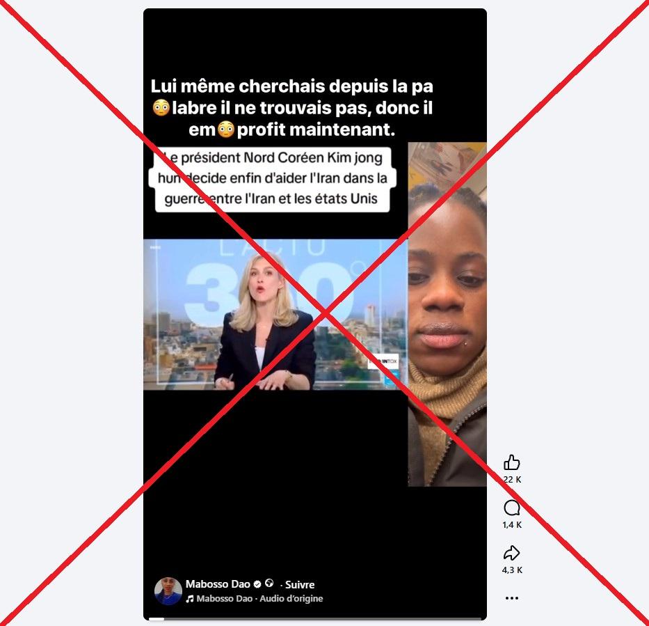 Dans ce contexte, des publications relayées sur les réseaux sociaux prétendent que la chaîne française France 24 aurait annoncé l'entrée en guerre de la Corée du Nord au côté de l'Iran.