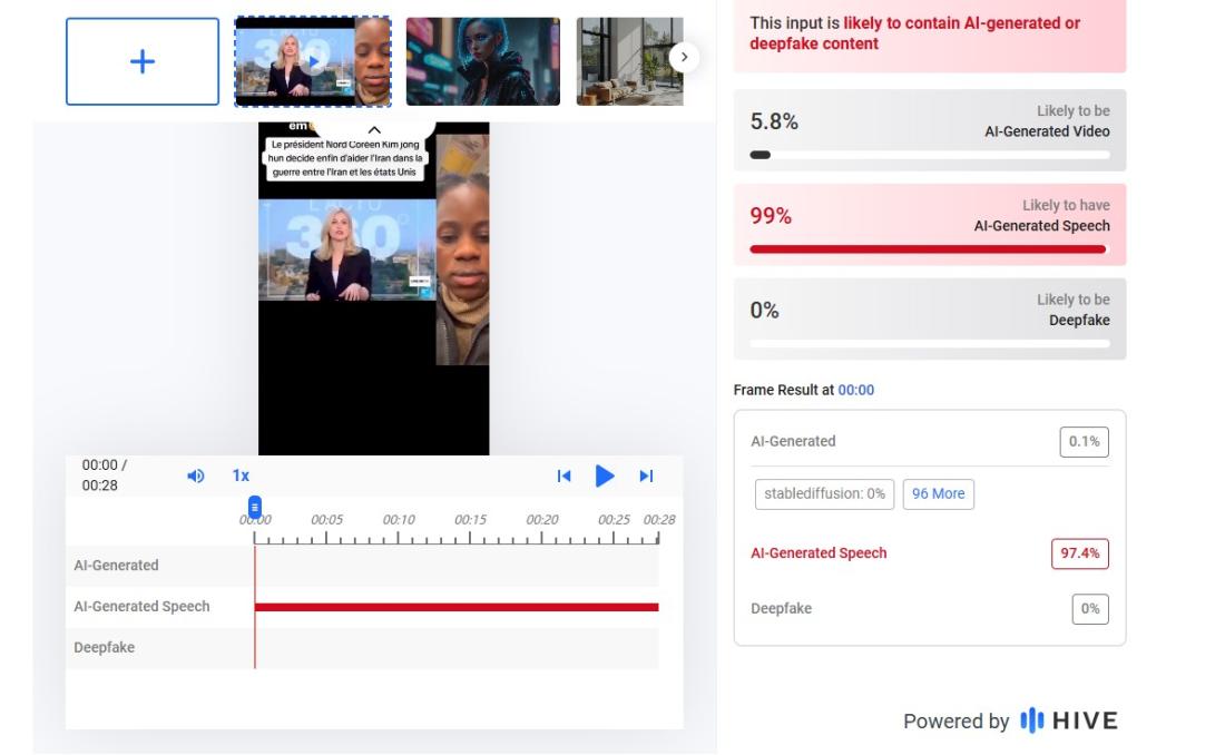 L’outil de détection de contenu généré par IA Hive Moderation vient d'ailleurs renforcer cette piste : après analyse, il suggère que le son de cette vidéo a 99% de probabilité d’avoir été généré à l’aide d’une intelligence artificielle.