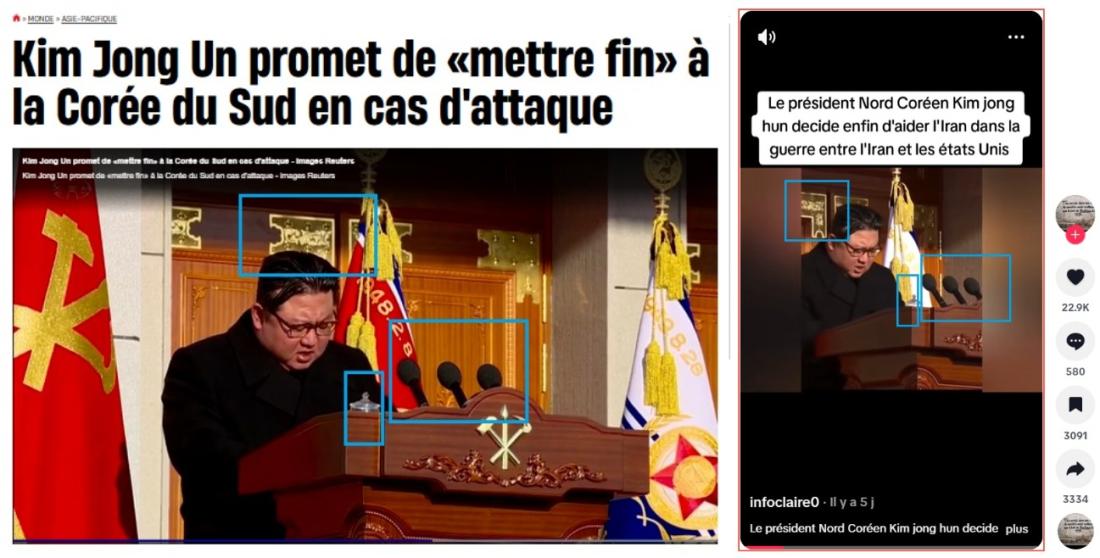 "Le président Nord Coréen Kim jong hun decide enfin d’aider l’Iran dans la guerre entre l’Iran et les états Unis (sic)", avance par exemple un texte apposé en filigrane sur une vidéo publiée sur TikTok le 25 mars 2026 et partagée près de 3.300 fois depuis.