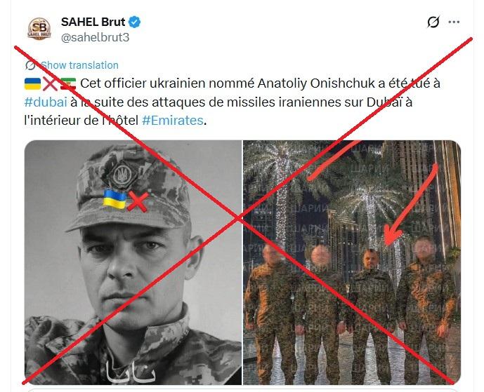 "Cet officier ukrainien nommé Anatoliy Onishchuk a été tué à Dubaï à la suite des attaques de missiles iraniennes sur Dubaï à l'intérieur de l'hôtel #Emirates", "Cet officier, membre d'une unité anti-drones, a été tué par un drone iranien qui visait le quartier général de l'unité", soutiennent des internautes sur X (1, 2, 3) et sur Facebook depuis le 31 mars, plus d'un mois après le début des frappes américaines et israéliennes sur l'Iran.