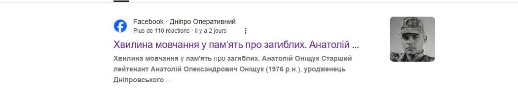 On peut y lire un extrait de texte indiquant : "Une minute de silence pour les disparus. Lieutenant Anatolii Oleksandrovych Onishchuk (né en 1976), natif de Dnipro". Contactée, la page Facebook n'avait pas donné suite aux sollicitations de l'AFP avant la publication de l'article.