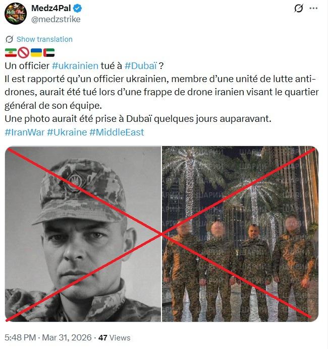 Le 31 mars 2026, le Centre de lutte contre la désinformation, une agence d'Etat ukrainienne mise en place pour tenter d'apporter du contexte aux rumeurs liées à l'Ukraine circulant sur internet, a quant à elle accusé la "propagande russe" de "diffuser des mensonges sur la prétendue mort de soldats ukrainiens aux Emirats arabes unis", citant la photo retouchée du soldat décédé à l'été 2024 comme supposée preuve de cette manipulation (lien archivé ici).