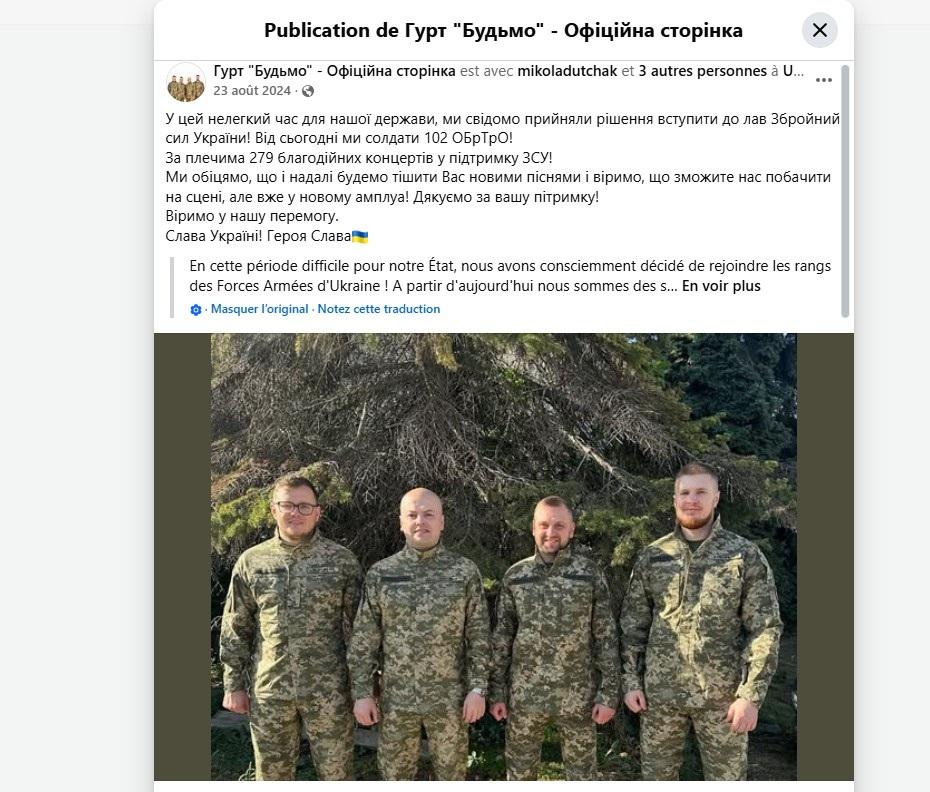 La photo d'origine émane d'une publication Facebook d'août 2024 du groupe de musique ukrainien Budmo, annonçant que ses membres avaient rejoint l'armée ukrainienne dans le conflit opposant le pays à la Russie (lien archivé ici).