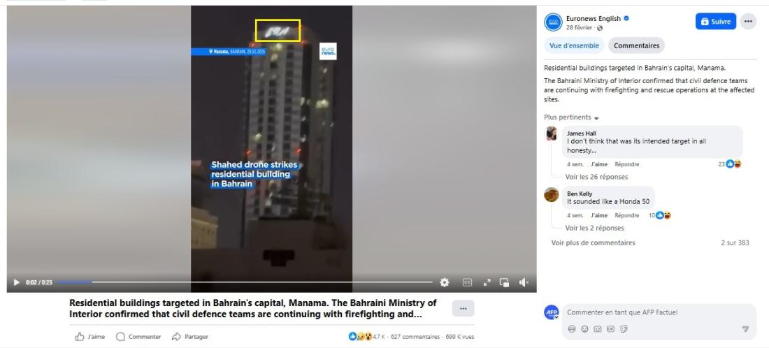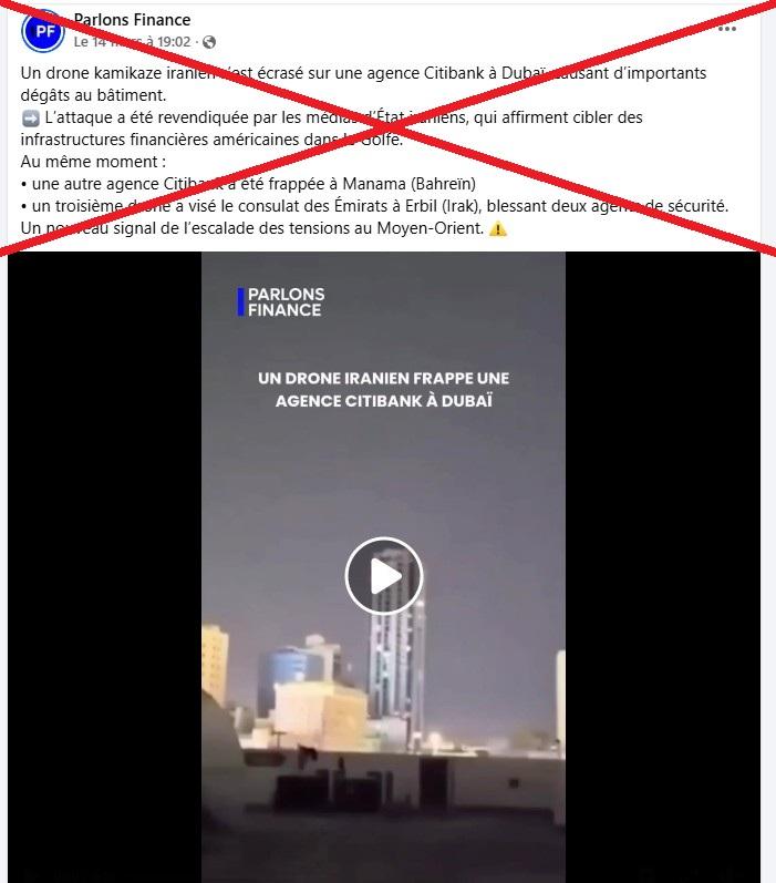 Cependant, les images que nous vérifions montrent en réalité une frappe contre un immeuble à Bahreïn, petit royaume du Golfe situé au large de l'Arabie saoudite et du Qatar. Par ailleurs, Citigroup a démenti les rumeurs faisant état de dégâts sur les bureaux de ses banques basés aux Emirats arabes unis et à Bahreïn.