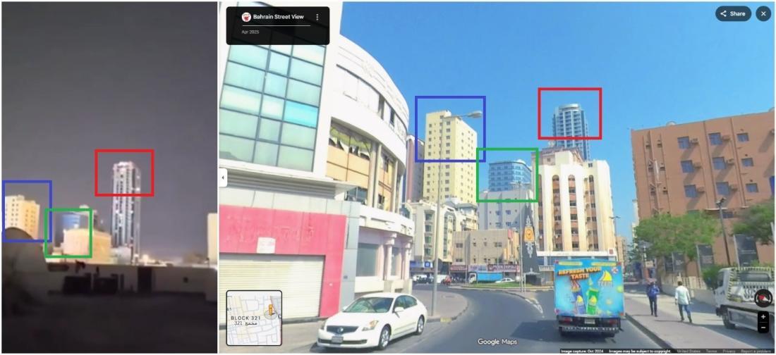En tapant "Era Tower" sur Google Maps, on retrouve des images de cette tour, observable de près sur Google Street View (lien archivé ici). A proximité, on identifie clairement les mêmes bâtiments que ceux présents dans la vidéo que nous vérifions. Il ne fait donc aucun doute qu'elle se trouve à Bahreïn, non pas à Dubaï, aux Emirats arabes unis.