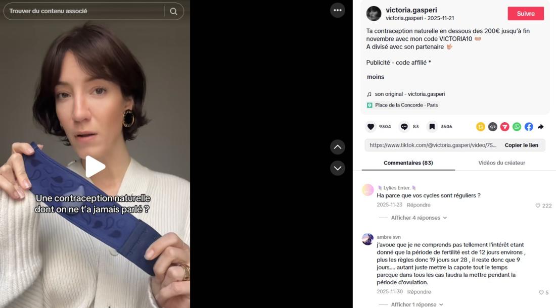De telles vidéos sont "dangereuses", juge Cécile Thomé, car elles "diabolisent" des méthodes de contraception qui "conviennent très bien à certaines femmes", à l'image de l'influenceuse Victoria Gasperi qui, après quatre ans de stérilet en cuivre "le déconseille absolument à tout le monde", dans une vidéo commerciale pour un thermomètre.