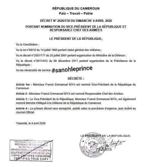 Tout d’abord, le décret prétendant acter la nomination de Franck Emmanuel Biya au poste de vice-président présente plusieurs incohérences. Il est par exemple daté du dimanche 4 avril 2026, alors que cette date correspondait à un samedi en 2026 (le dimanche étant le 5 avril).
