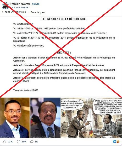 De nombreuses publications, comme ce post aimé plus de 1.200 fois, mettent en avant un soi-disant décret du 4 avril signé de la main de Paul Biya. "Monsieur Franck Emmanuel BIYA est nommé Vice-Président de la République du Cameroun", peut-on ainsi lire dans le premier article.