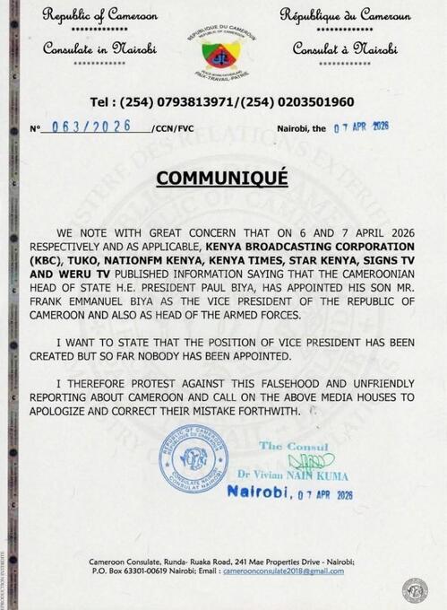 Dans ce communiqué authentifié par AFP Factuel, la consule camerounaise Vivian Nain Kuma se dit "très préoccupée" par le fait que plusieurs médias kényans - comme KBC, le Kenya Times ou encore Weru TV - aient relayé ces "informations mensongères et malveillantes concernant le Cameroun".