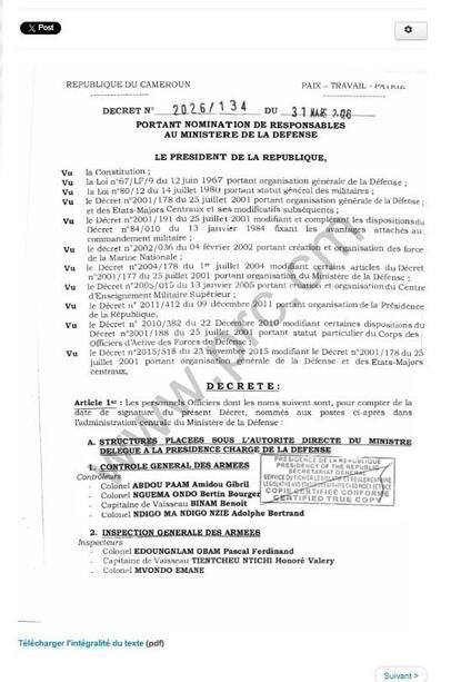Le document en circulation se distingue également par une typographie inhabituelle, différente de celle des décrets officiels récents qu’on peut trouver sur le site de la présidence camerounaise (lien archivé ici).