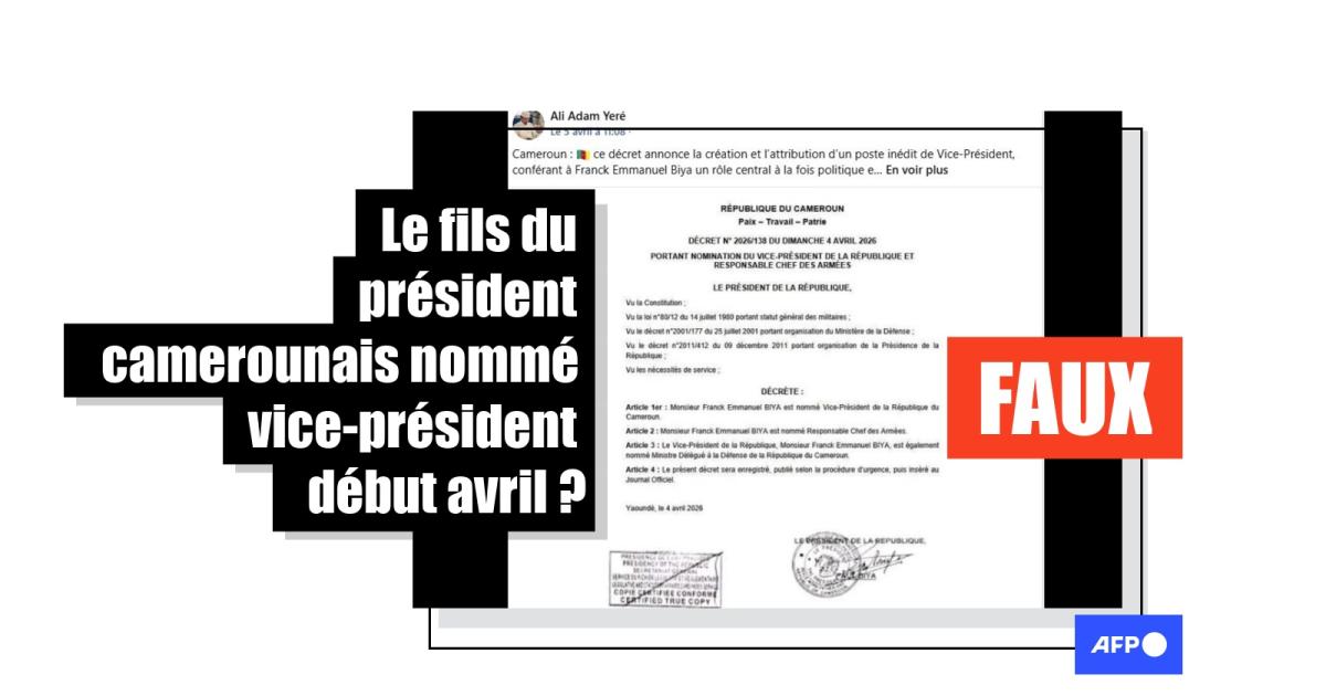 Mais Franck Biya n’a pas été nommé vice-président du Cameroun début avril par son père. S'il n’est pas exclu que ce soit un jour le cas, aucun vice-président n’a été nommé pour le moment. Le décret qui circule en ligne - et qui comporte plusieurs incohérences - est un faux, a démenti une ambassade camerounaise.