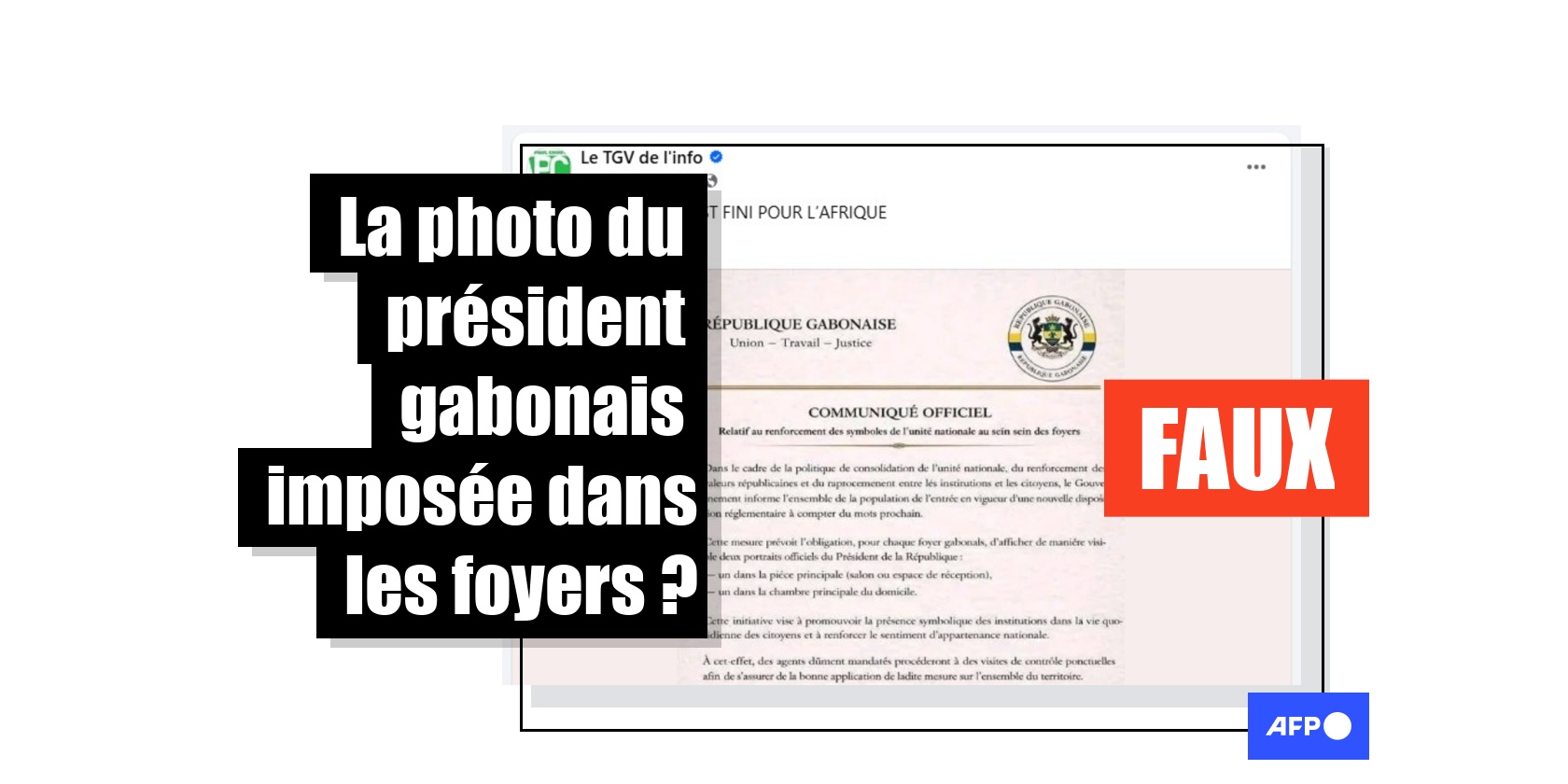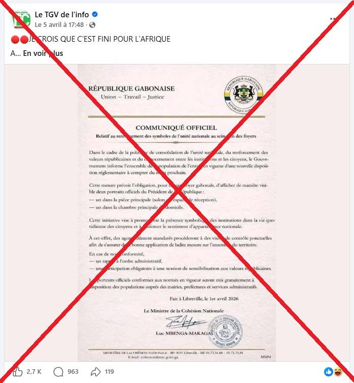 "Au Gabon, la photo du président Brice Clotaire Oligui Nguema est désormais obligatoire dans toutes les maisons", prétend un post sur Facebook qui cumule plus de 2.700 mentions "j’aime" depuis sa publication le 5 avril 2026.