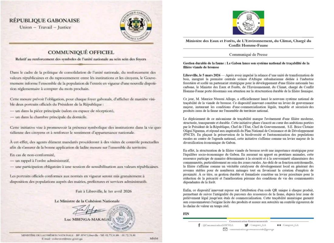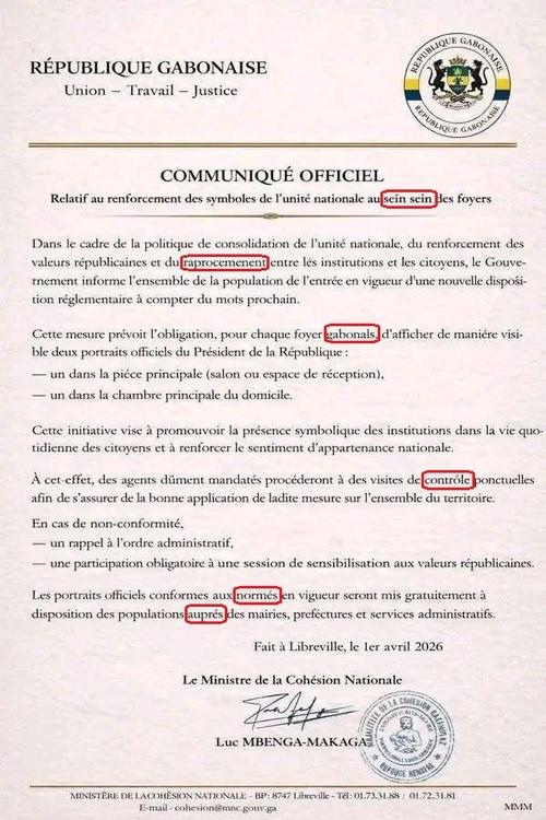 Par ailleurs, deux incohérences majeures figurent dans le prétendu communiqué annonçant l’obligation d’accrocher le portrait du président dans les foyers gabonais : tout d’abord, il n’existe aucun "ministère de la Cohésion sociale" au Gabon. On s’en rend compte grâce à une rapide recherche sur internet. Le seul ministère portant la mention "social" est celui du Travail, du Plein Emploi, du Dialogue Social et de la Formation Professionnelle.